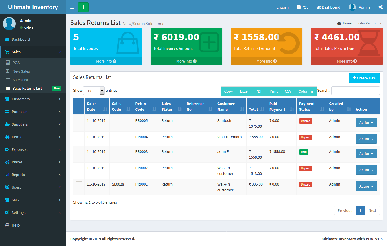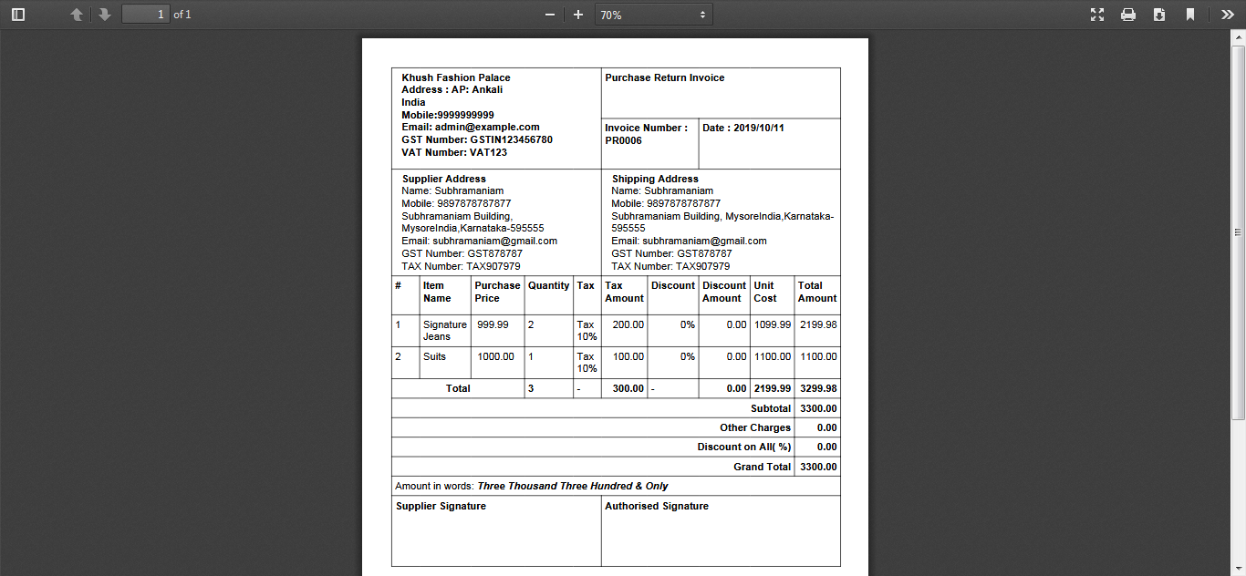 You can view the all the added Purchases Returns list and you can Purchases Return list by Delete & Edit actions.